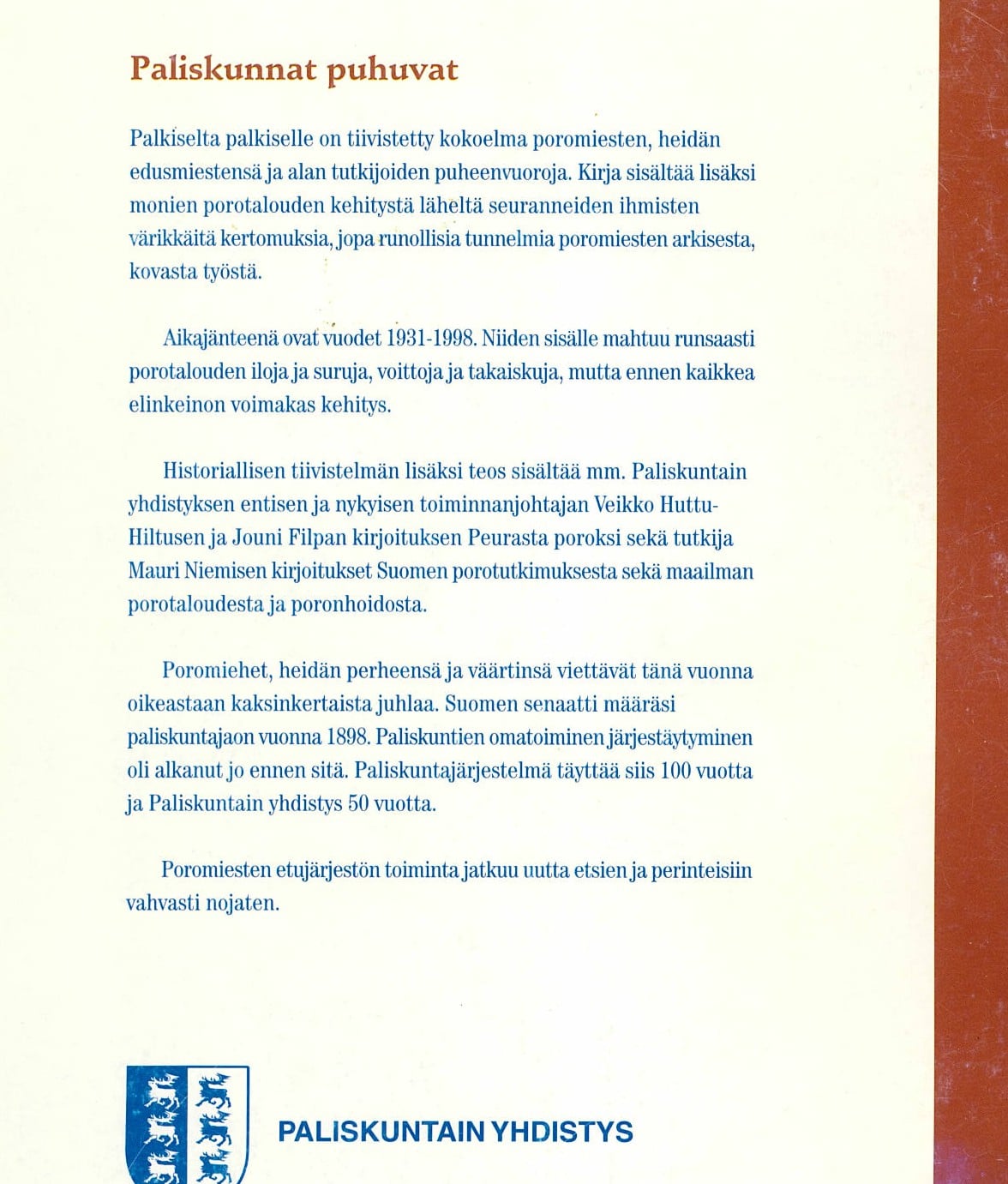 Paliskuntain yhdistys 50 vuotta 1948-1998 .. Katso lisää takakannen kuvasta.