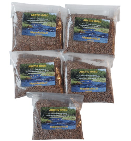 Tarjouspaketti 5 vaskaushiekkapussia. Pussissa 5 kpl vaskaushippua 1 -2mm Arctic Gold. Aitoja Lapin kultahippuja 5 kpl vaskaushiekassa 1 -2mm Arctic Gold nugget Lapland Ivalojoki kulta-alueelta vaskaushiekka.
